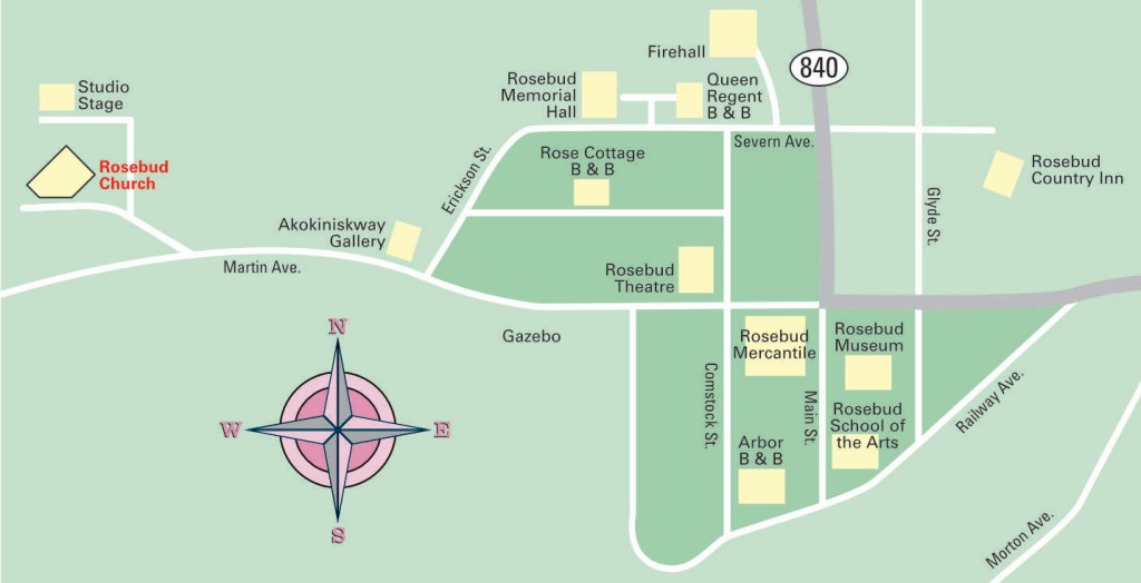 Rosebud is a community church (map below) including friends from surrounding area— staff, students and families of Rosebud School of the Arts (Rosebud Theatre), as well as our many guests. Attendees come from a wide variety of Christian faith traditions, and include all who are wanting to explore their spiritual life more fully. Worship teams with diverse backgrounds and styles alternate in leading the Sunday mornings. The acoustics of the church amplify beautifully the Rosebud Choir, and events hosted here which include the Rosebud annual Christmas concert, as well as the Rosebud Chamber Music Festival.